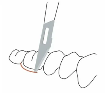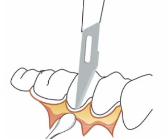 3- A terceira incisão é feita perpendicular a superfície radicular e o mais próximo possível da crista óssea, separando desse modo, o colar de tecido do osso alveolar (fonte: Lindhe,2010).