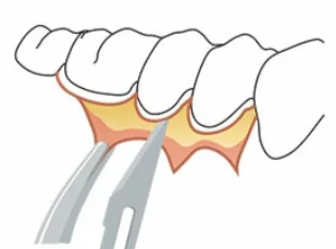 2- Após o cuidadoso afastamento do retalho é realizada uma segunda incisão intra-sulcular até a crista óssea alveolar para separar o colar tecidual da superfície radicular. (fonte: Lindhe. 2010)